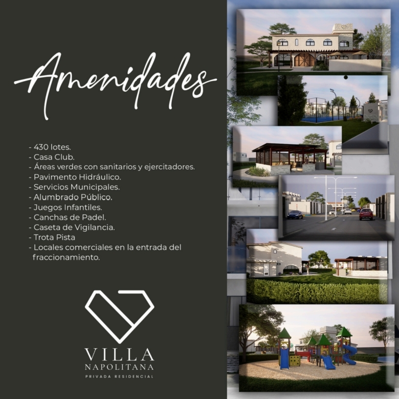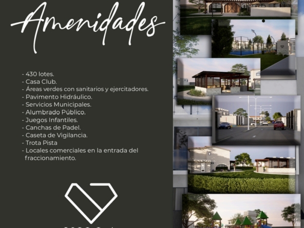 Pavimento hidráulico, alumbrado publico, juegos infantiles, canchas de padel, caseta de vigilancia, pista para trotar.